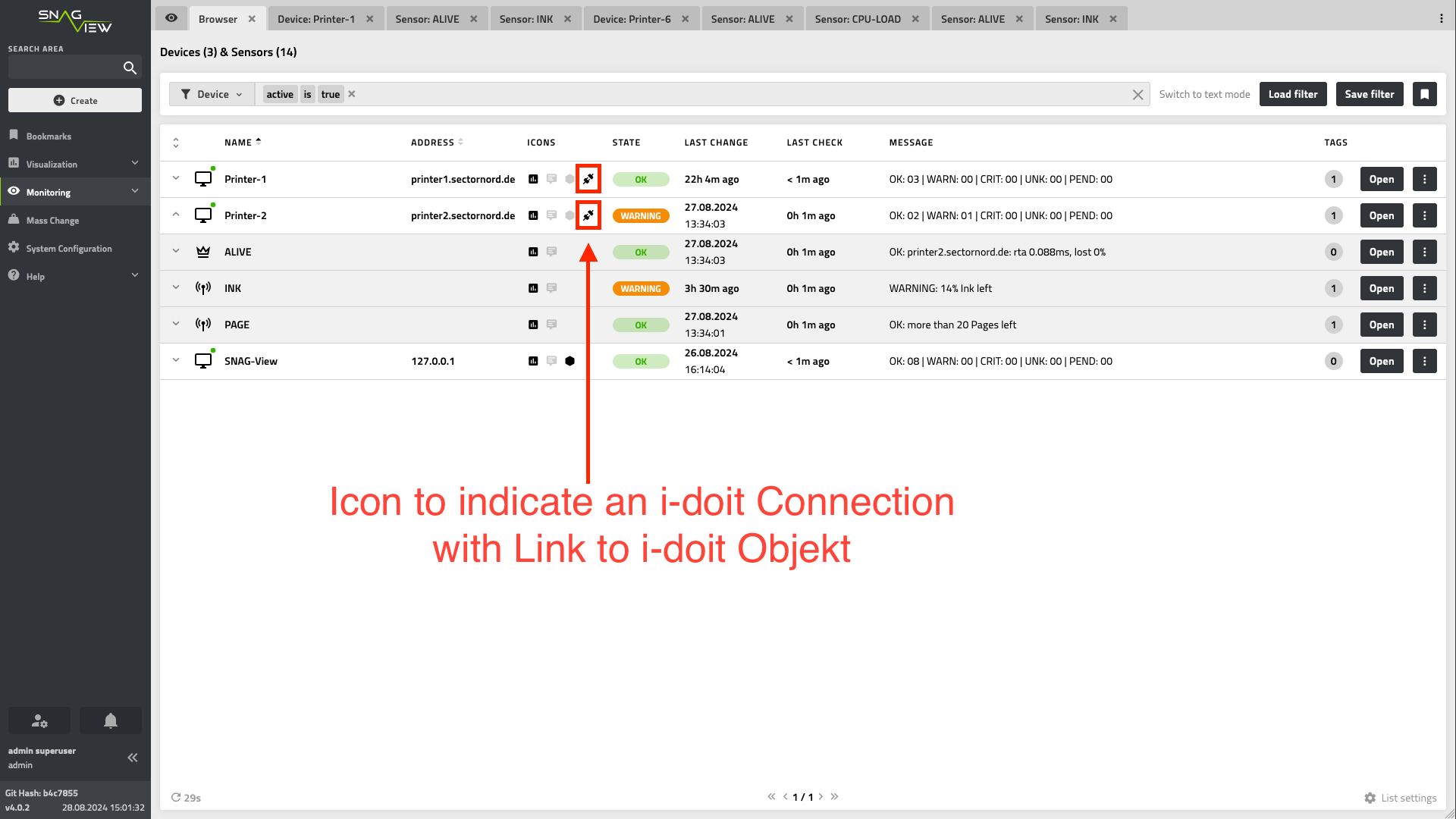 Innerhalb von SNAG-View wird durch ein kleines Icon signalisiert, dass das entsprechende Device aus der i-doit CMDB stammt und dort verwaltet wird. Dieses Icon ist mit der Übersichtsseite des entsprechenden Objekts in i-doit verlinkt, sodass schnell darauf zugegriffen werden kann, wenn detaillierte Informationen benötigt werden.